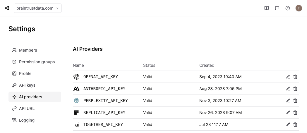 You can use your OpenAI, Anthropic, and Perplexity API keys to access their respective models. However, if you're a Braintrust user, you can create a single API key that will work across services (even on the free plan). Create a Braintrust account and enter a value for each service you'd like to use: