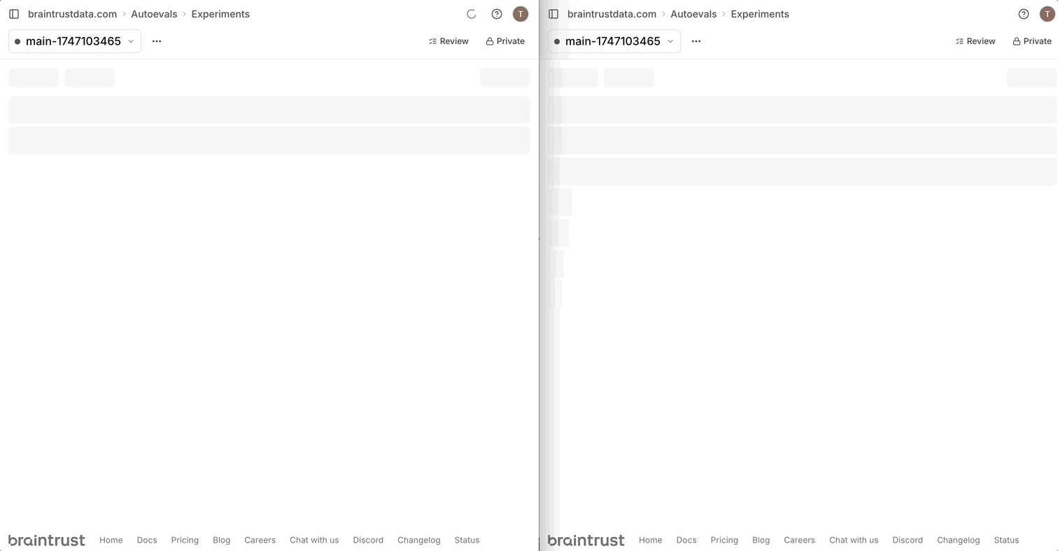 Experiments are core to the evaluation feedback loop in Braintrust. They're where you analyze results over time through rich visualizations and detailed metrics. You can instantly identify score regressions by specific fields and compare megabytes of JSON using side-by-side diffs, all while monitoring key metrics like cost, token counts, and error rates.