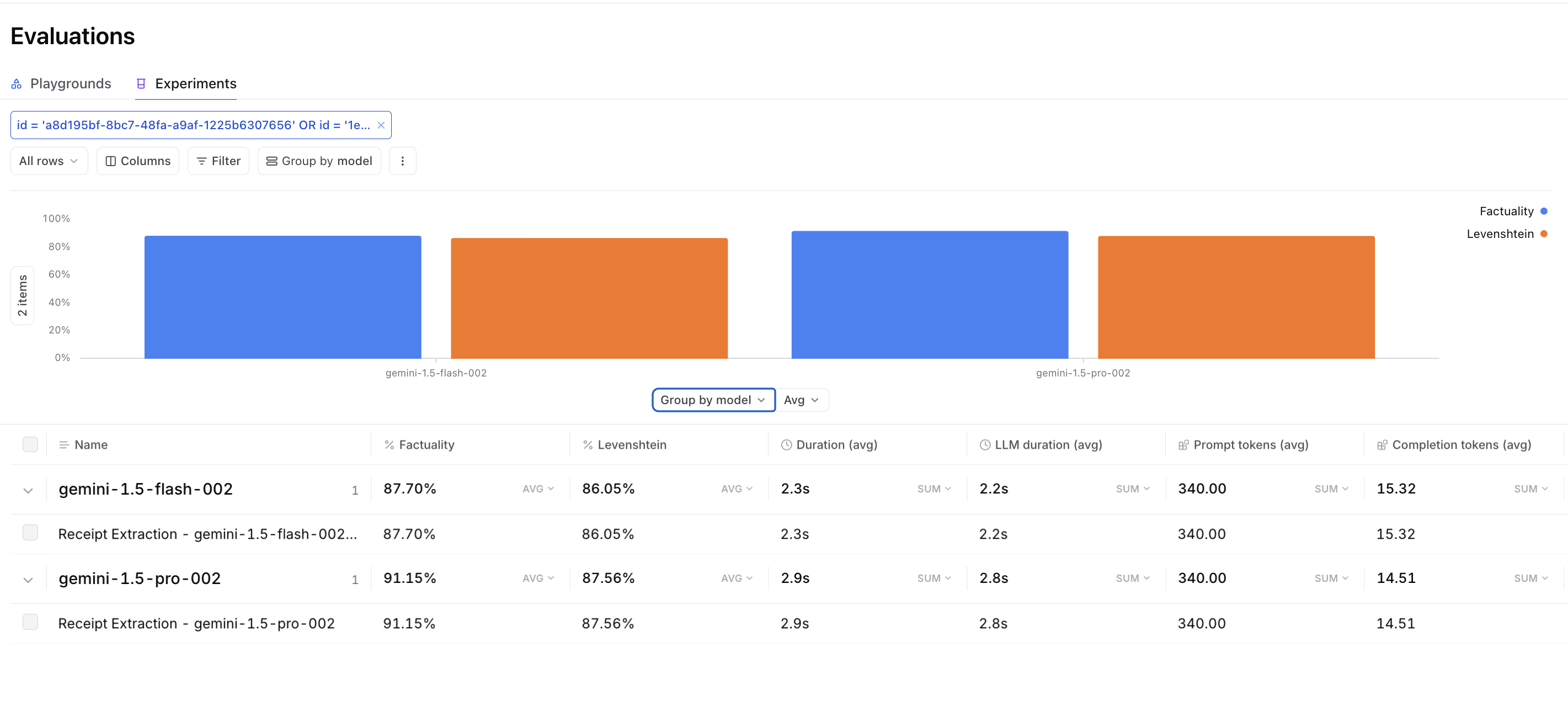 ModelFactualityLevenshteinPrompt tokensCompletion tokensLLM duration