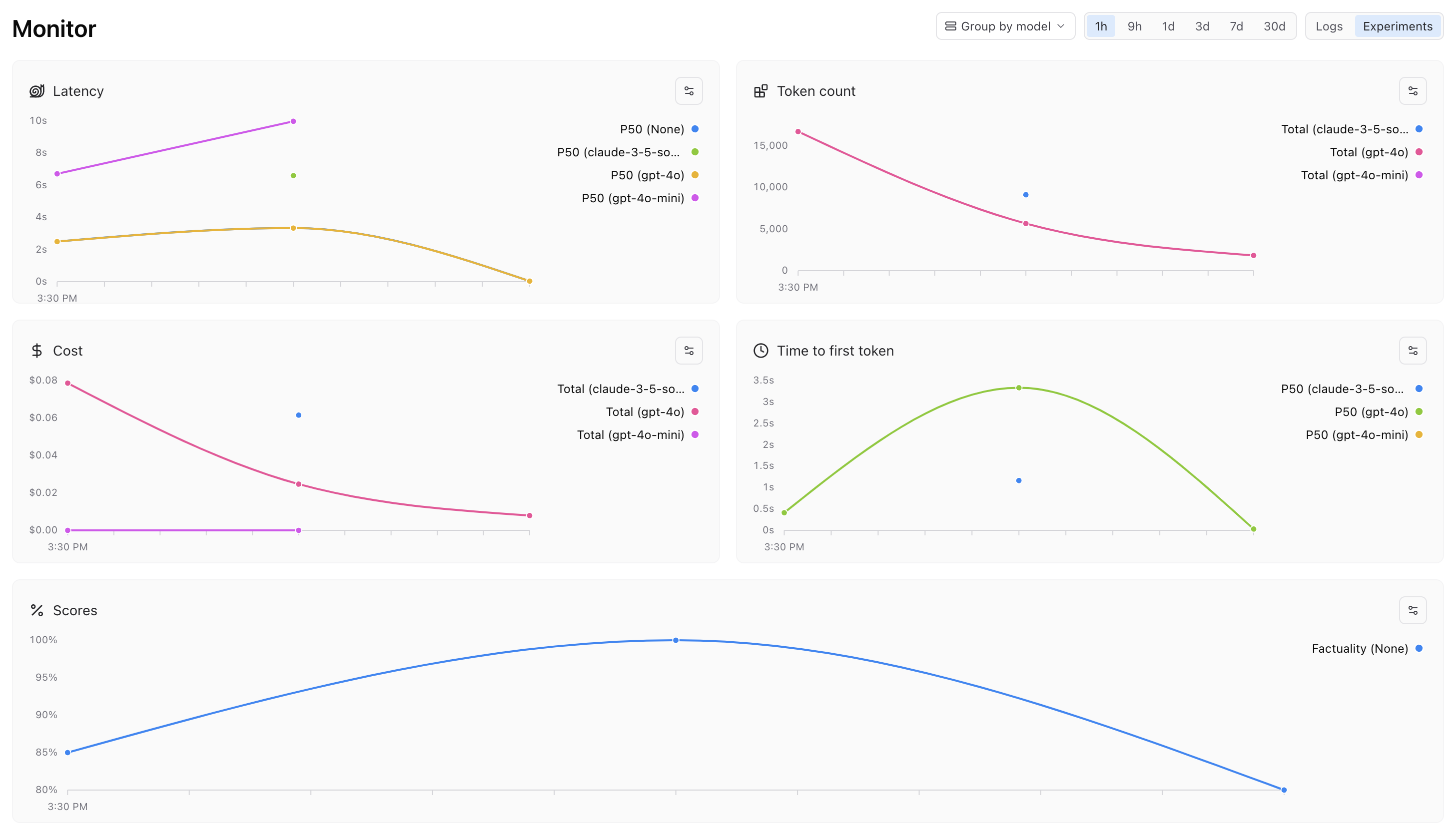 After shipping the new model in production, you can keep tabs on its performance on the Monitor page. To focus on your model change, select Group by model and tighten the timeline to when you made the changes.